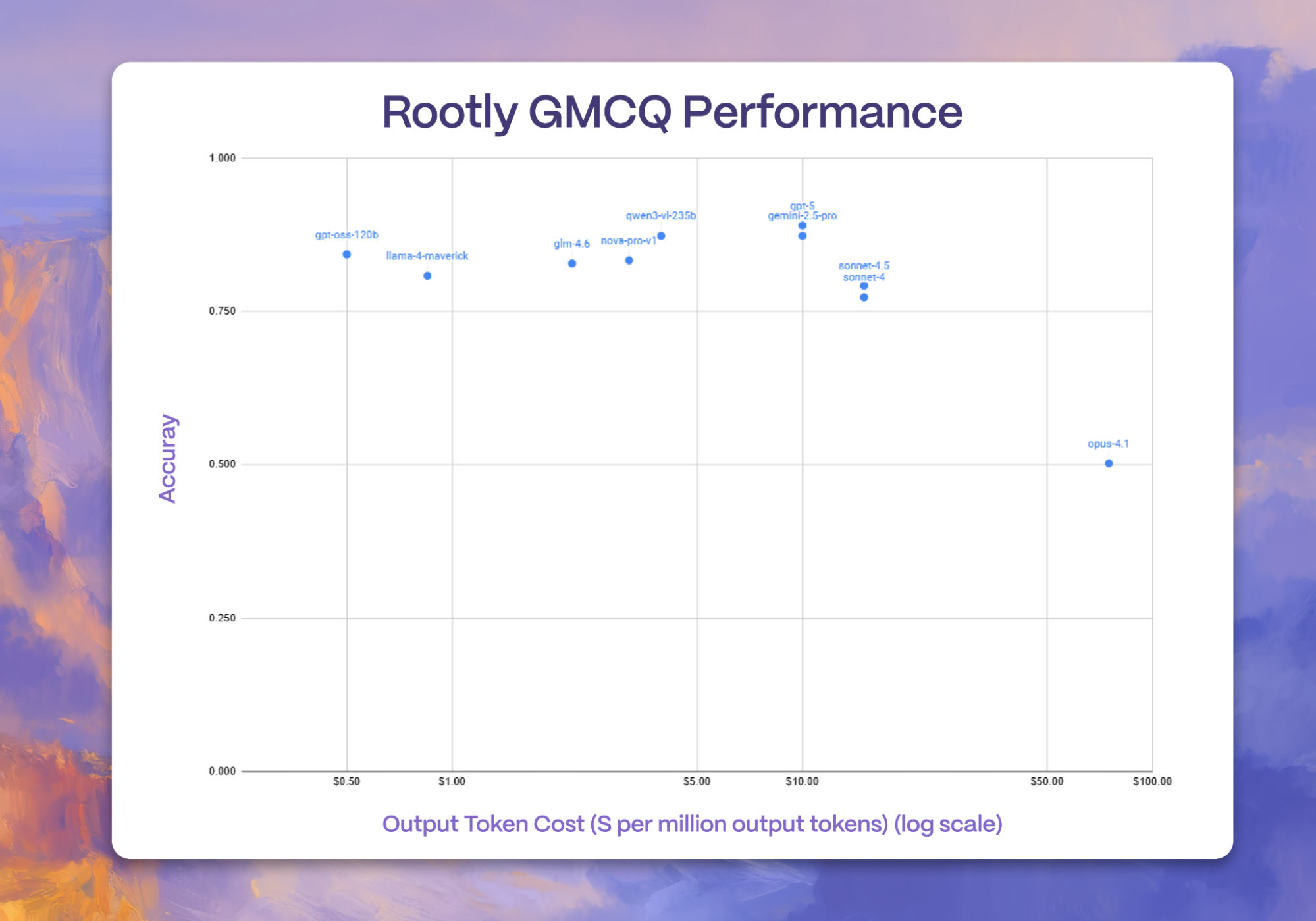 We first evaluated a selection of frontier models on our Rootly GitHub Multiple Choice Questions (GMCQ) task, which is part of our EFCB benchmarking suite. Using Groq’s OpenBench evaluation framework, this GMCQ evaluation set looks at 600 multiple choice questions sourced from six popular GitHub repositories. Each question takes a real-world pull request title and description, and then asks a model which code diff (out of four real-world code diffs from the same repository) successfully resolved that GitHub pull request. As a result, GMCQ allows developers to easily evaluate a model’s ability to understand code and its capacity to identify code diffs that can successfully close issues during development.