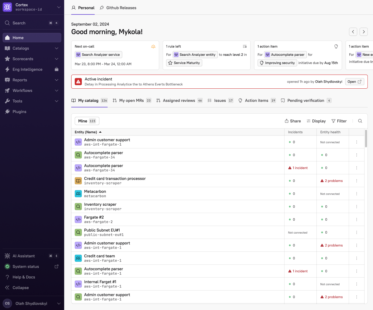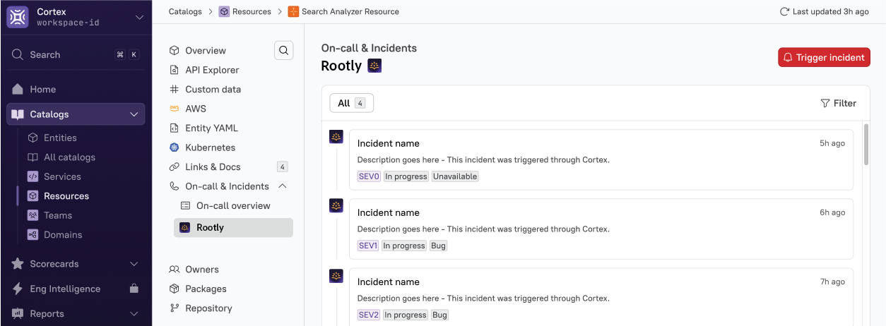 Developers also get a Rootly Catalog in Cortex as part of this integration, where they can get an overview of the incidents happening across services.