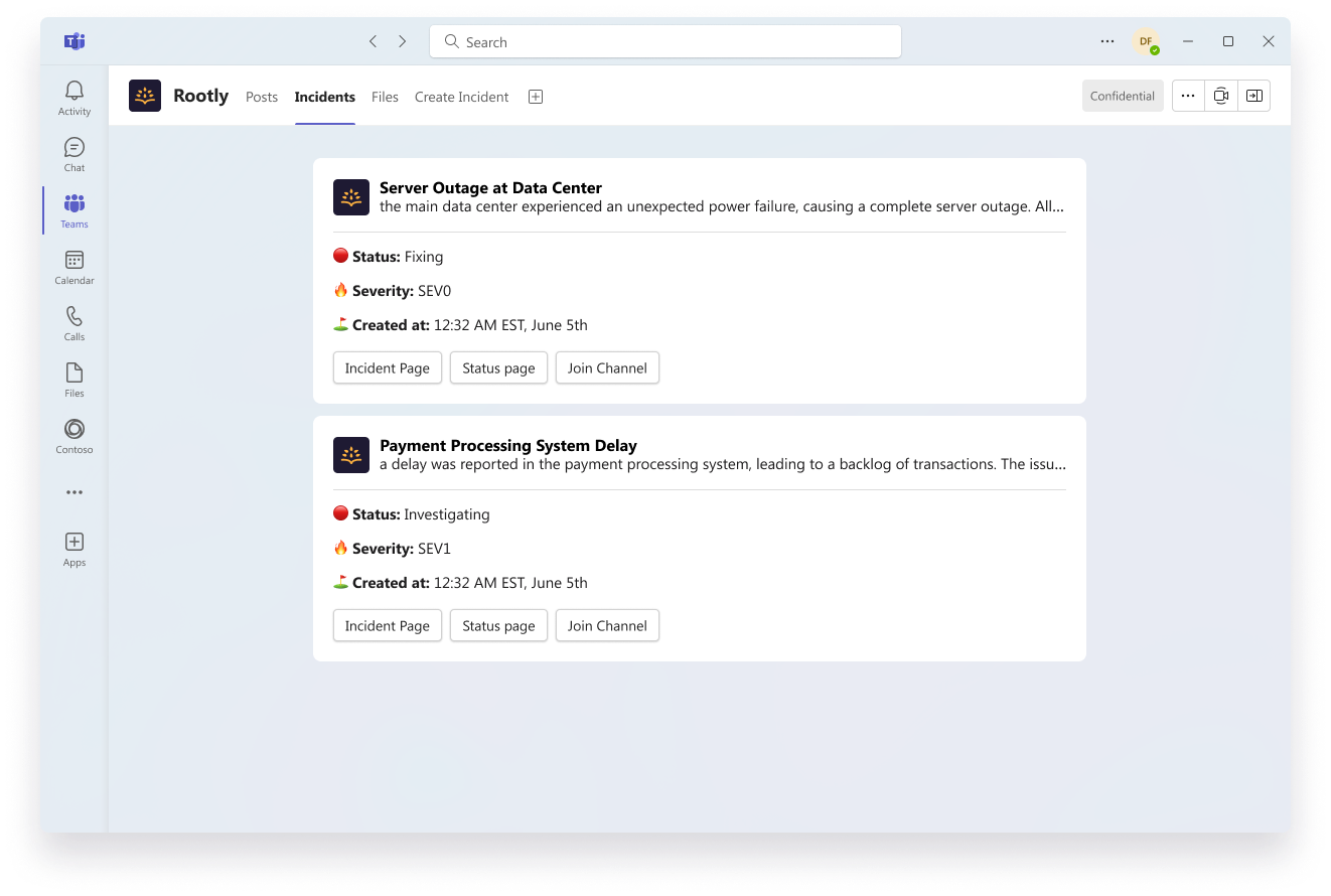 - Incident orchestration natively in Teams: Spin up dedicated channels and tabs for incidents directly within Teams, so all stakeholders—engineers, leadership, customer ops—can rally around one source of truth.