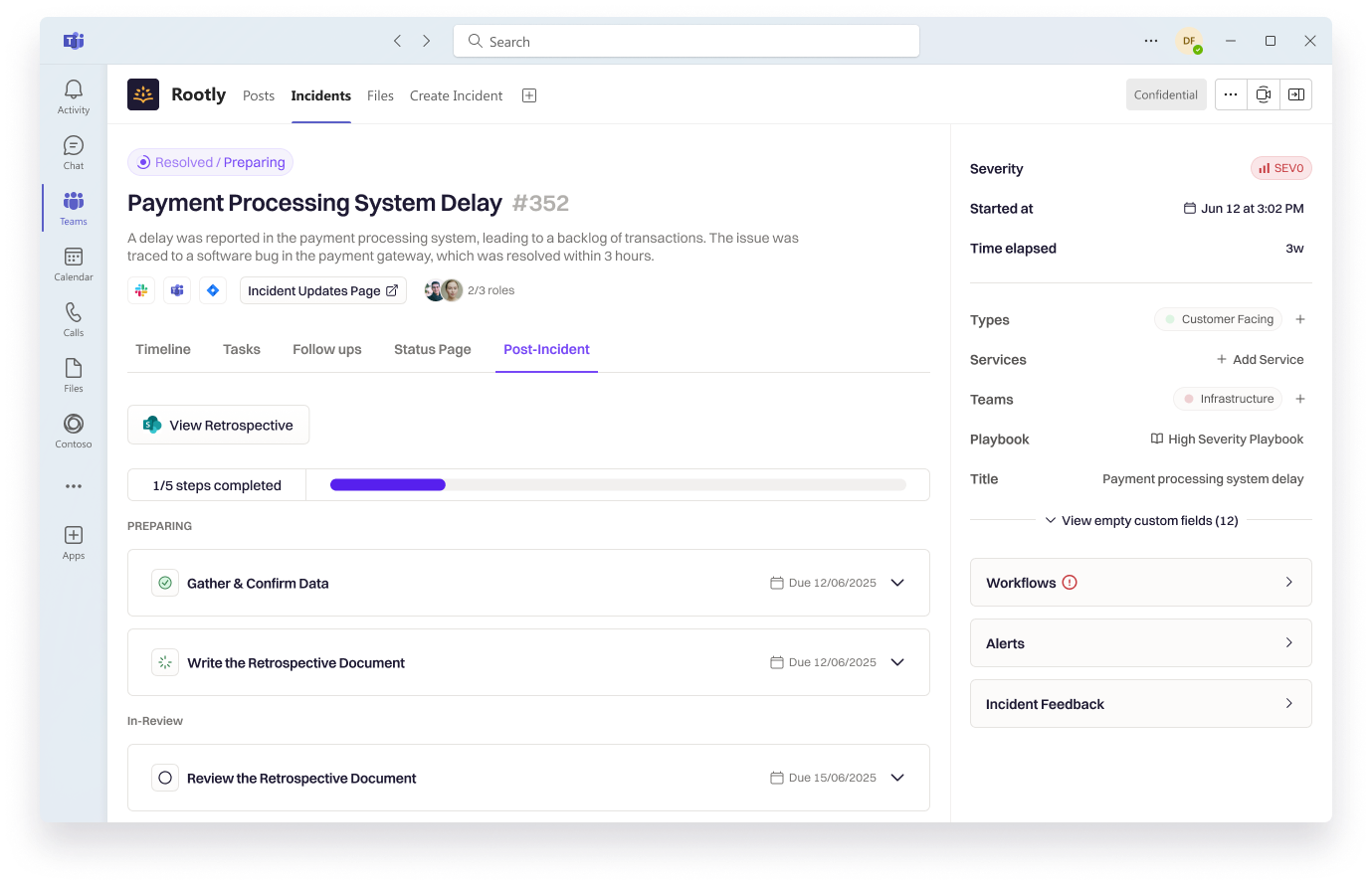 New enhancements and better UX to supercharge Microsoft Teams as your central hub for incident response. You can declare, triage, collaborate, document, and coordinate—without switching tools. Integrate seamlessly with Outlook for scheduling retro meetings, SharePoint for retro docs, and Teams for calls and chat to keep your workflows unified and auditable.