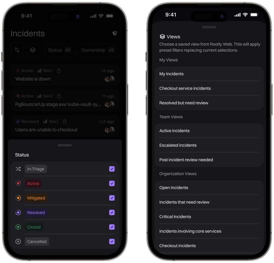 • Consistent views across platforms: Use any existing Filter Views you’ve already built on web, ensuring a unified viewing experience across Rootly Mobile and Rootly Web.