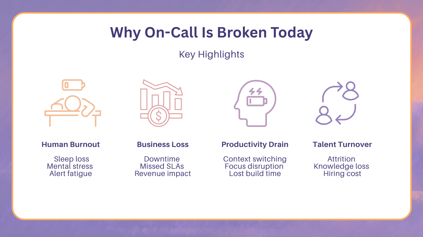 When an engineer is interrupted mid-flow, they lose much more than the moment of disruption. Returning to the original mentally demanding task often requires a decompression period before cognitive focus can resume. This cycle of interruption and recovery means hours of productive engineering time vanish each week. The irony is that engineers are hired to build, but manual on-call forces them to react rather than create.