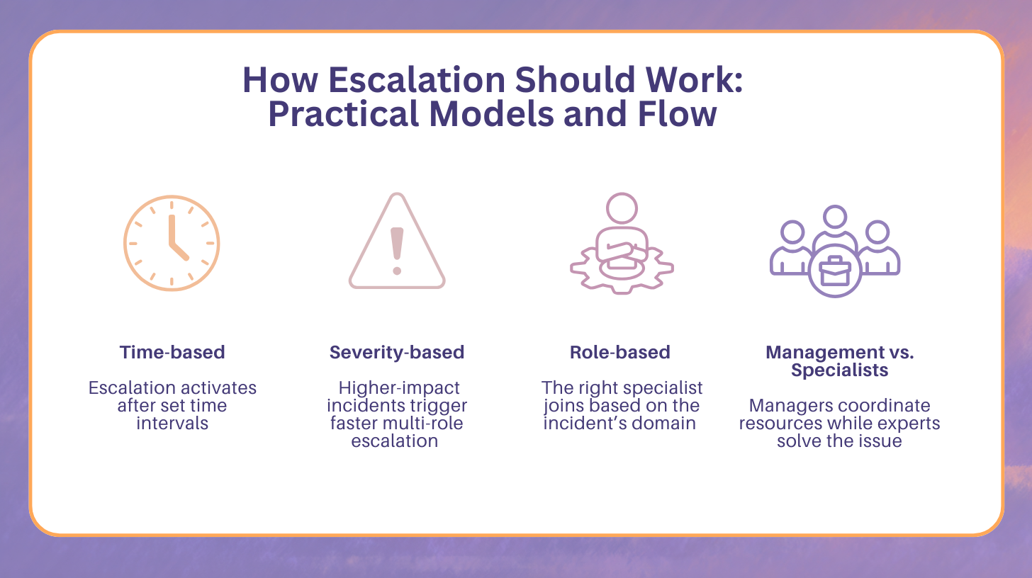 - Clearly defined escalation roles prevent confusion and help incidents flow toward resolution instead of bottlenecking at one individual.
