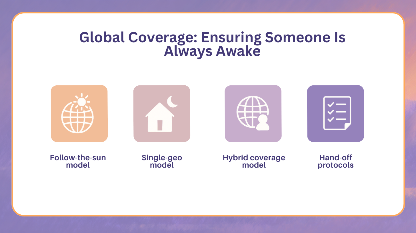 Single-region teams keep tight cultural and communication cohesion. The drawback is sleep interruptions and local fatigue concentration. This approach requires strong alert tuning to avoid burnout.